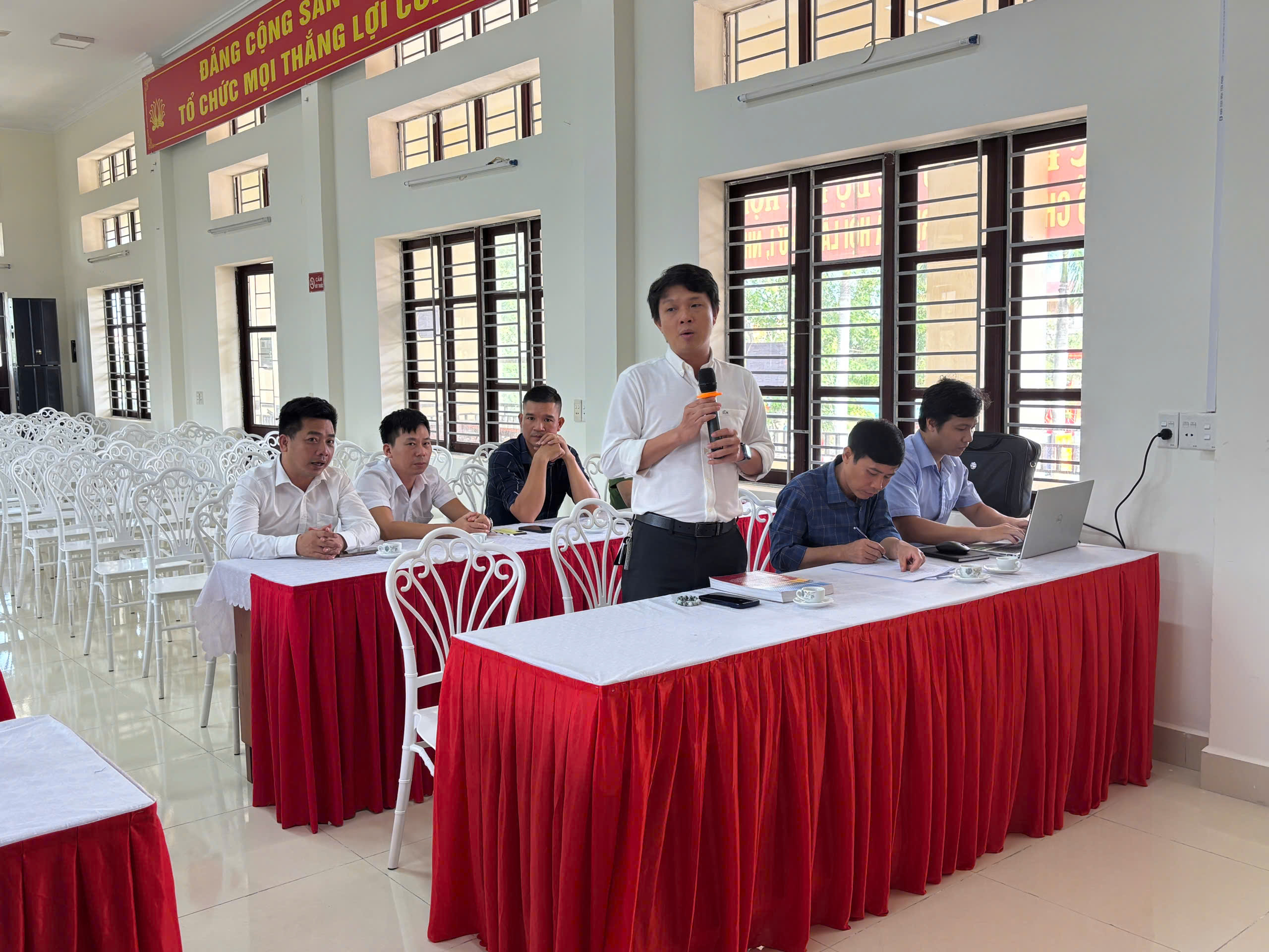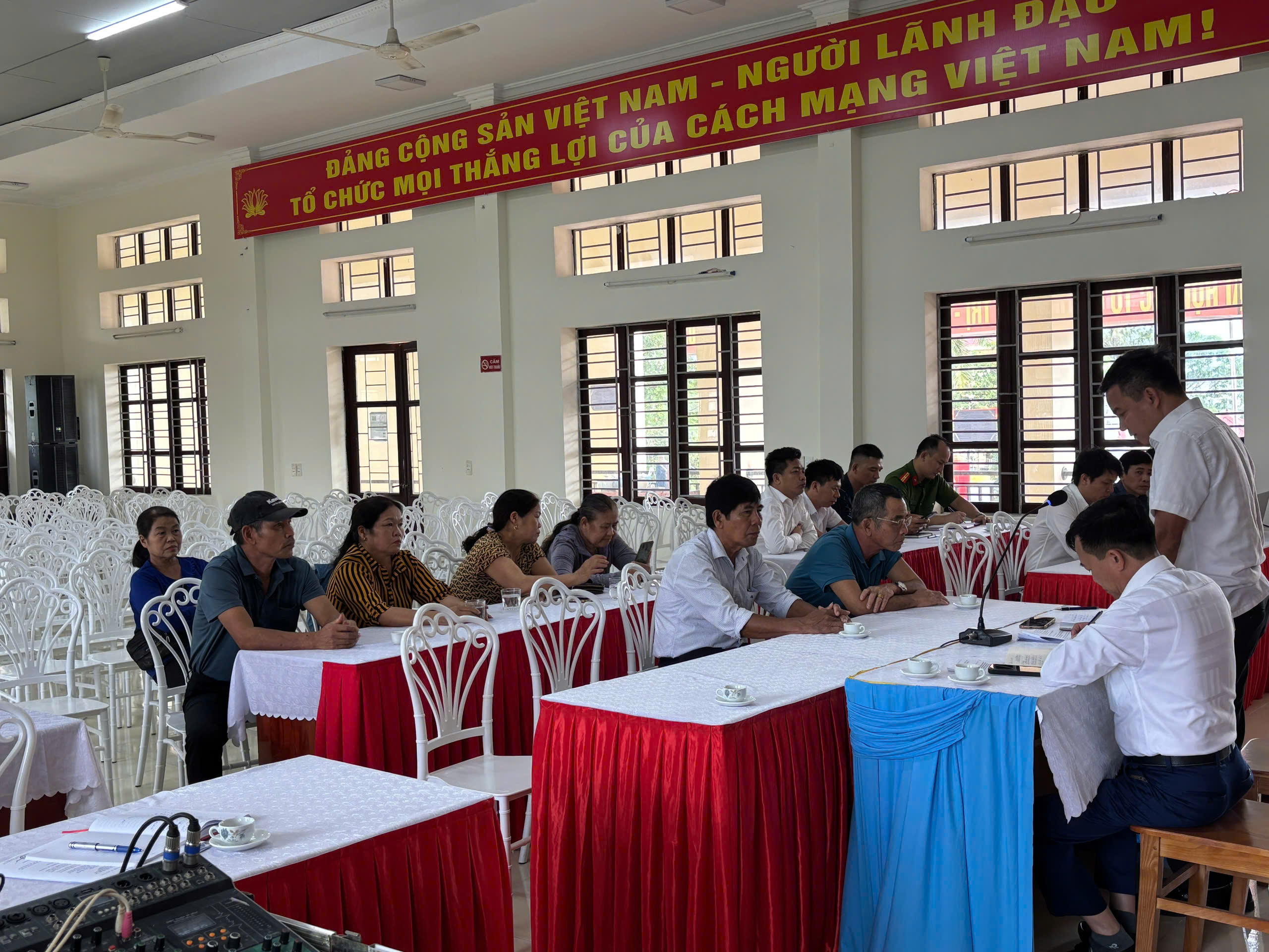 Đồng chí Nguyễn Thế Đoàn Phó chủ tịch UBND xã, Trưởng Ban cưỡng chế thu hồi đất, cùng đồng chí Đỗ Thái Quyến Phó trưởng phòng Kinh tế chủ trì hội nghị đối thoại với 06 hộ sử dụng đất có Quyết định cưỡng chế thu hồi đất.